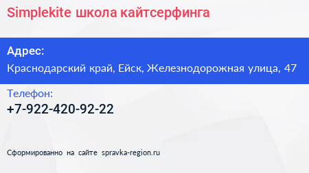 Simplekite, школа кайтсерфинга по адресу Краснодарский край, Ейск, Железнодорожная улица, 47 в дальнейшем Организация, размещена в следующих категориях: