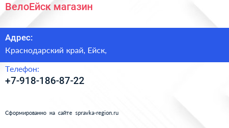 ВелоЕйск, магазин по адресу Краснодарский край, Ейск, в дальнейшем Организация, размещена в следующих категориях: