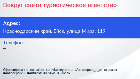 Вокруг света, туристическое агентство по адресу Краснодарский край, Ейск, улица Мира, 119 в дальнейшем Организация, размещена в следующих категориях: