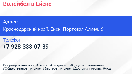 Волейбол в Ейске по адресу Краснодарский край, Ейск, Портовая Аллея, 6 в дальнейшем Организация, размещена в следующих категориях: