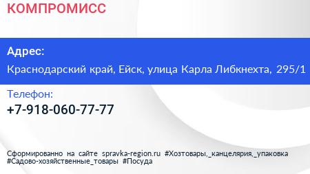 КОМПРОМИСС по адресу Краснодарский край, Ейск, улица Карла Либкнехта, 295/1 в дальнейшем Организация, размещена в следующих категориях: