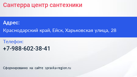 Сантерра, центр сантехники по адресу Краснодарский край, Ейск, Харьковская улица, 28 в дальнейшем Организация, размещена в следующих категориях: