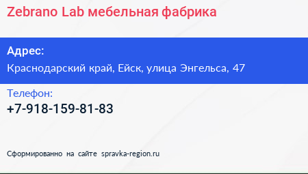 Zebrano Lab, мебельная фабрика по адресу Краснодарский край, Ейск, улица Энгельса, 47 в дальнейшем Организация, размещена в следующих категориях: