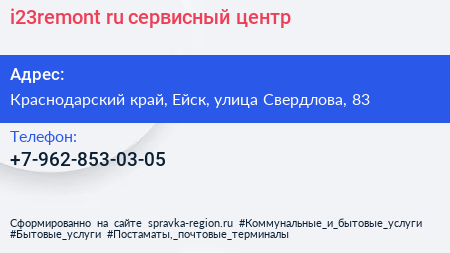 i23remont.ru, сервисный центр по адресу Краснодарский край, Ейск, улица Свердлова, 83 в дальнейшем Организация, размещена в следующих категориях: