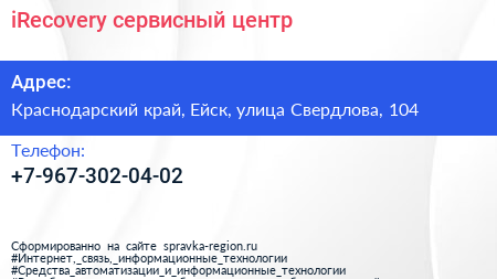 iRecovery, сервисный центр по адресу Краснодарский край, Ейск, улица Свердлова, 104 в дальнейшем Организация, размещена в следующих категориях: