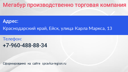 Мегабур, производственно-торговая компания по адресу Краснодарский край, Ейск, улица Карла Маркса, 13 в дальнейшем Организация, размещена в следующих категориях: