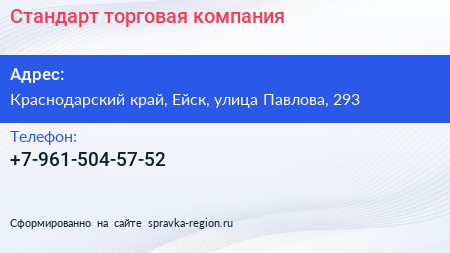 Стандарт, торговая компания по адресу Краснодарский край, Ейск, улица Павлова, 293 в дальнейшем Организация, размещена в следующих категориях: