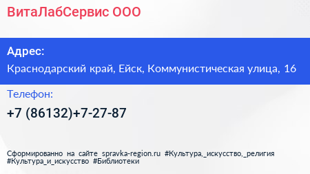 ВитаЛабСервис, ООО по адресу Краснодарский край, Ейск, Коммунистическая улица, 16 в дальнейшем Организация, размещена в следующих категориях: