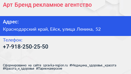 Арт-Бренд, рекламное агентство по адресу Краснодарский край, Ейск, улица Ленина, 52 в дальнейшем Организация, размещена в следующих категориях: