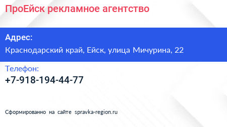 ПроЕйск, рекламное агентство по адресу Краснодарский край, Ейск, улица Мичурина, 22 в дальнейшем Организация, размещена в следующих категориях: