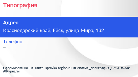 Типография по адресу Краснодарский край, Ейск, улица Мира, 132 в дальнейшем Организация, размещена в следующих категориях: