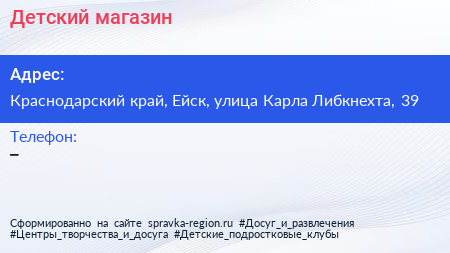Детский магазин по адресу Краснодарский край, Ейск, улица Карла Либкнехта, 39 в дальнейшем Организация, размещена в следующих категориях:
