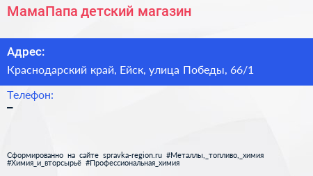 МамаПапа, детский магазин по адресу Краснодарский край, Ейск, улица Победы, 66/1 в дальнейшем Организация, размещена в следующих категориях: