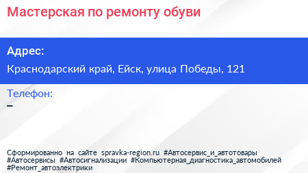 Мастерская по ремонту обуви по адресу Краснодарский край, Ейск, улица Победы, 121 в дальнейшем Организация, размещена в следующих категориях: