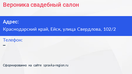 Вероника, свадебный салон по адресу Краснодарский край, Ейск, улица Свердлова, 102/2 в дальнейшем Организация, размещена в следующих категориях: