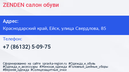 ZENDEN, салон обуви по адресу Краснодарский край, Ейск, улица Свердлова, 85 в дальнейшем Организация, размещена в следующих категориях: