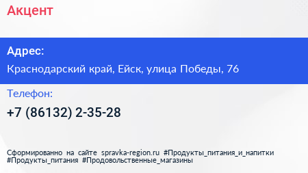 Акцент по адресу Краснодарский край, Ейск, улица Победы, 76 в дальнейшем Организация, размещена в следующих категориях: