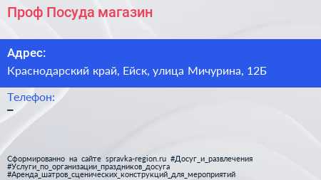 Проф Посуда, магазин по адресу Краснодарский край, Ейск, улица Мичурина, 12Б в дальнейшем Организация, размещена в следующих категориях: