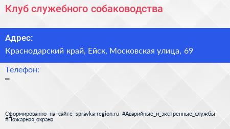 Клуб служебного собаководства по адресу Краснодарский край, Ейск, Московская улица, 69 в дальнейшем Организация, размещена в следующих категориях: