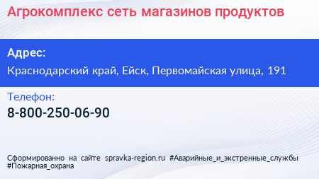Агрокомплекс, сеть магазинов продуктов по адресу Краснодарский край, Ейск, Первомайская улица, 191 в дальнейшем Организация, размещена в следующих категориях: