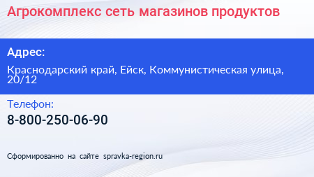Агрокомплекс, сеть магазинов продуктов по адресу Краснодарский край, Ейск, Коммунистическая улица, 20/12 в дальнейшем Организация, размещена в следующих категориях: