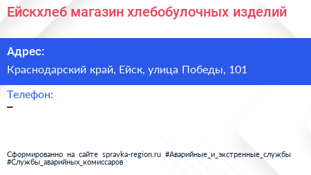 Ейскхлеб, магазин хлебобулочных изделий по адресу Краснодарский край, Ейск, улица Победы, 101 в дальнейшем Организация, размещена в следующих категориях:
