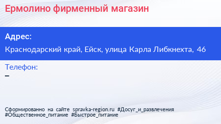 Ермолино, фирменный магазин по адресу Краснодарский край, Ейск, улица Карла Либкнехта, 46 в дальнейшем Организация, размещена в следующих категориях: