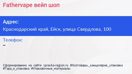 Fathervape, вейп-шоп по адресу Краснодарский край, Ейск, улица Свердлова, 100 в дальнейшем Организация, размещена в следующих категориях: