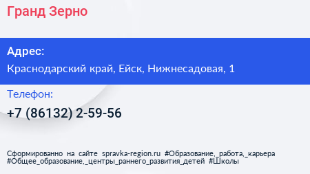 Гранд-Зерно по адресу Краснодарский край, Ейск, Нижнесадовая, 1 в дальнейшем Организация, размещена в следующих категориях: