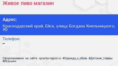 Живое пиво, магазин по адресу Краснодарский край, Ейск, улица Богдана Хмельницкого, 90 в дальнейшем Организация, размещена в следующих категориях: