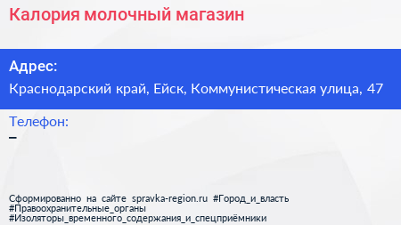 Калория, молочный магазин по адресу Краснодарский край, Ейск, Коммунистическая улица, 47 в дальнейшем Организация, размещена в следующих категориях: