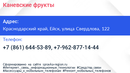 Каневские фрукты по адресу Краснодарский край, Ейск, улица Свердлова, 122 в дальнейшем Организация, размещена в следующих категориях:
