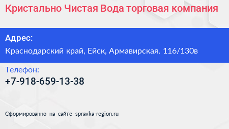 Кристально Чистая Вода, торговая компания по адресу Краснодарский край, Ейск, Армавирская, 116/130в в дальнейшем Организация, размещена в следующих категориях: