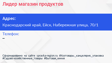 Лидер, магазин продуктов по адресу Краснодарский край, Ейск, Набережная улица, 70/1 в дальнейшем Организация, размещена в следующих категориях: