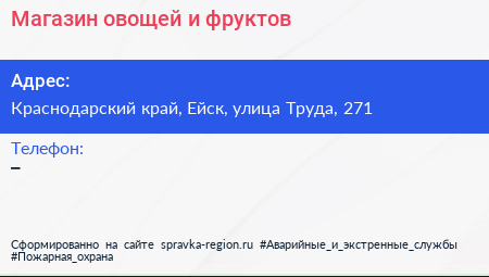 Магазин овощей и фруктов по адресу Краснодарский край, Ейск, улица Труда, 271 в дальнейшем Организация, размещена в следующих категориях: