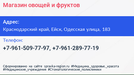 Магазин овощей и фруктов по адресу Краснодарский край, Ейск, Одесская улица, 183 в дальнейшем Организация, размещена в следующих категориях: