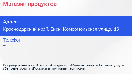 Магазин продуктов по адресу Краснодарский край, Ейск, Комсомольская улица, 19 в дальнейшем Организация, размещена в следующих категориях: