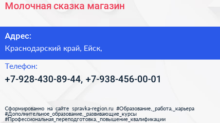 Молочная сказка, магазин по адресу Краснодарский край, Ейск, в дальнейшем Организация, размещена в следующих категориях: