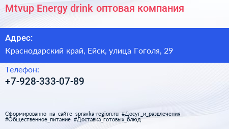 Mtvup! Energy drink, оптовая компания по адресу Краснодарский край, Ейск, улица Гоголя, 29 в дальнейшем Организация, размещена в следующих категориях:
