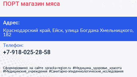 ПОРТ, магазин мяса по адресу Краснодарский край, Ейск, улица Богдана Хмельницкого, 182 в дальнейшем Организация, размещена в следующих категориях: