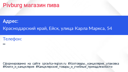 Pivburg, магазин пива по адресу Краснодарский край, Ейск, улица Карла Маркса, 54 в дальнейшем Организация, размещена в следующих категориях: