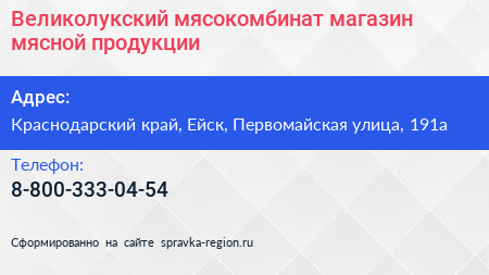Великолукский мясокомбинат, магазин мясной продукции по адресу Краснодарский край, Ейск, Первомайская улица, 191а в дальнейшем Организация, размещена в следующих категориях: