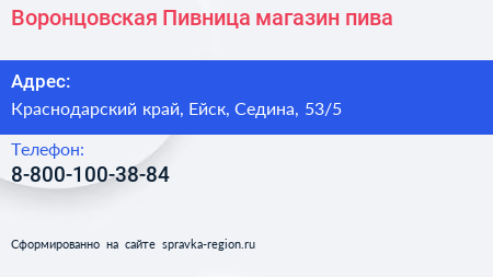 Воронцовская Пивница, магазин пива по адресу Краснодарский край, Ейск, Седина, 53/5 в дальнейшем Организация, размещена в следующих категориях: