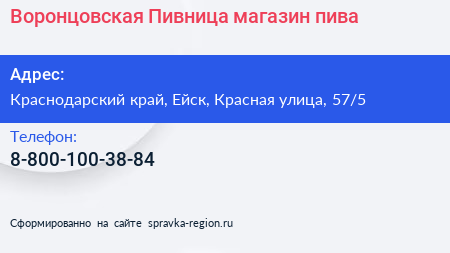 Воронцовская Пивница, магазин пива по адресу Краснодарский край, Ейск, Красная улица, 57/5 в дальнейшем Организация, размещена в следующих категориях: