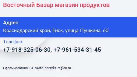 Восточный Базар, магазин продуктов по адресу Краснодарский край, Ейск, улица Пушкина, 60 в дальнейшем Организация, размещена в следующих категориях: