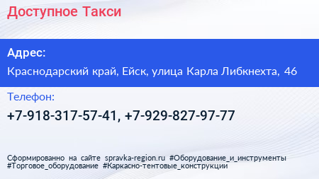 Доступное Такси по адресу Краснодарский край, Ейск, улица Карла Либкнехта, 46 в дальнейшем Организация, размещена в следующих категориях: