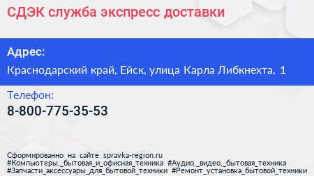 СДЭК, служба экспресс-доставки по адресу Краснодарский край, Ейск, улица Карла Либкнехта, 1 в дальнейшем Организация, размещена в следующих категориях: