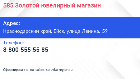 585 Золотой, ювелирный магазин по адресу Краснодарский край, Ейск, улица Ленина, 59 в дальнейшем Организация, размещена в следующих категориях: