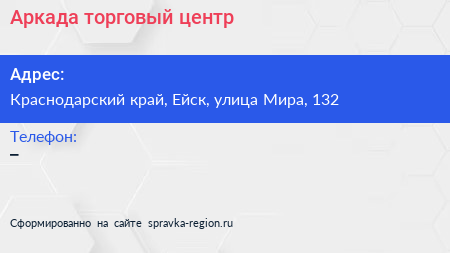 Аркада, торговый центр по адресу Краснодарский край, Ейск, улица Мира, 132 в дальнейшем Организация, размещена в следующих категориях:
