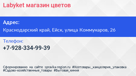 Labyket, магазин цветов по адресу Краснодарский край, Ейск, улица Коммунаров, 26 в дальнейшем Организация, размещена в следующих категориях: